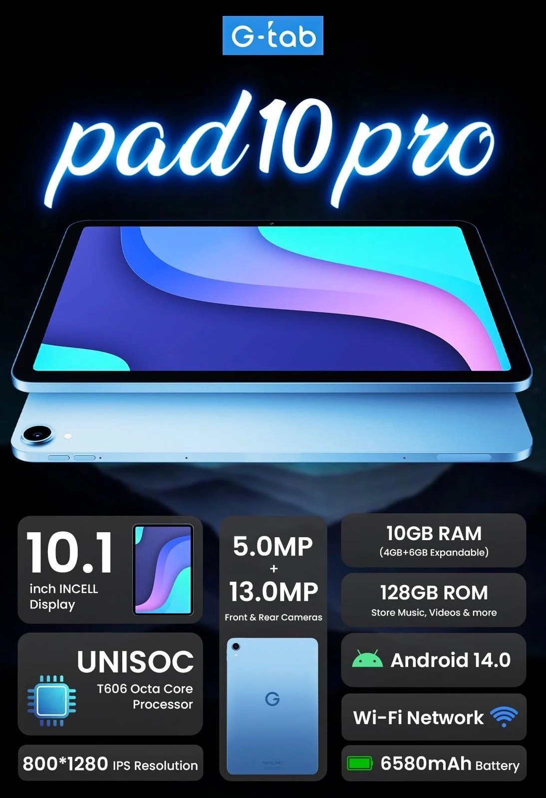 G-TAB Pad10 Pro Tablet – 10.1-inch Display, 128GB Storage, 10GB RAM